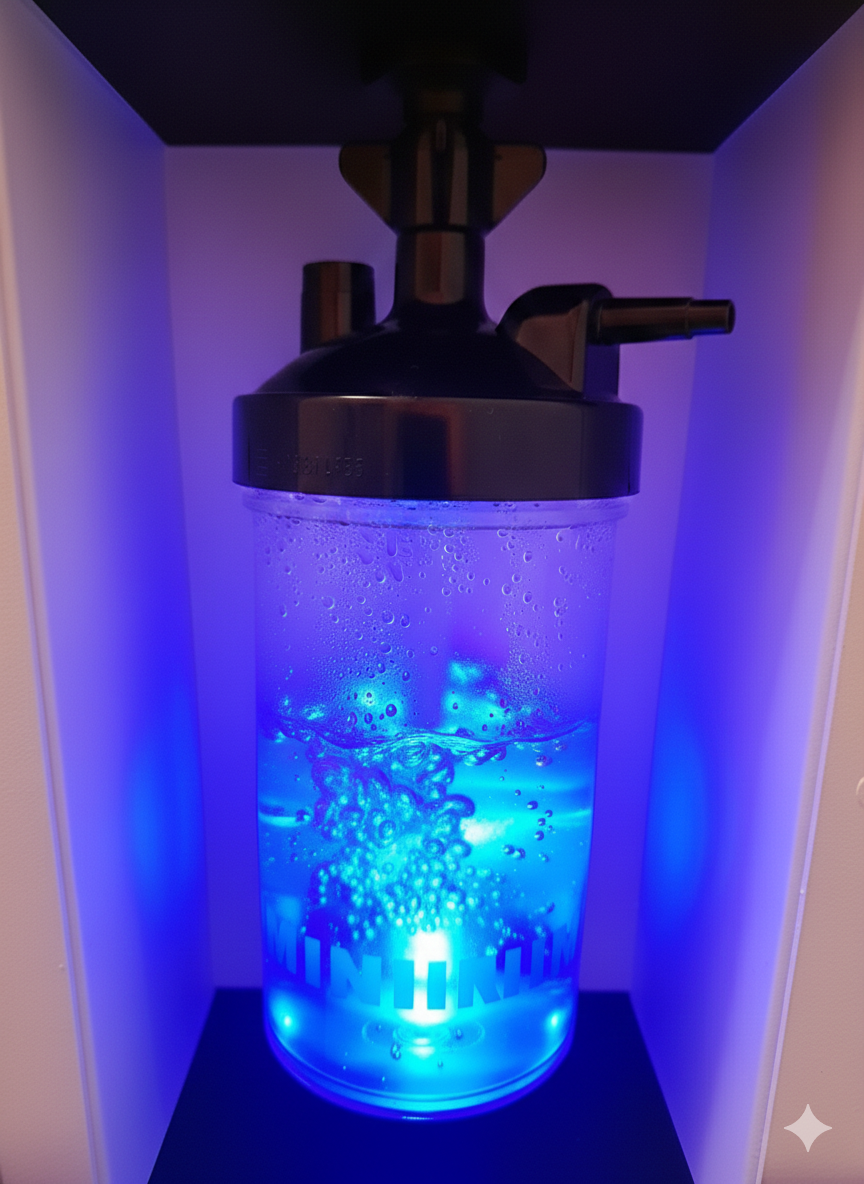 - Inhalacja przebiega za pomocą kaniuli nosowych, przez które do układu oddechowego trafia subtelna mgiełka wzbogacona cząsteczkami wodoru.