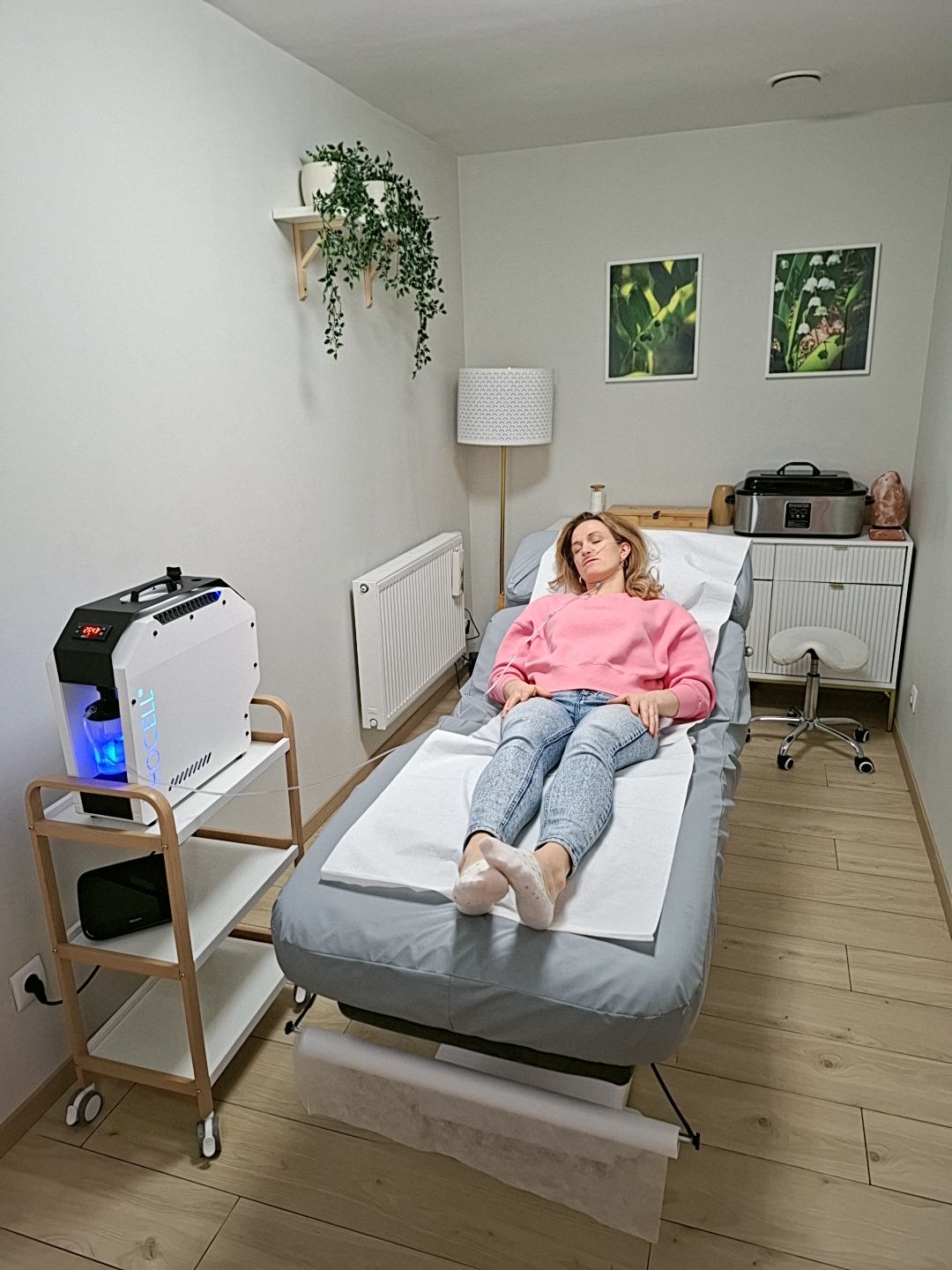 - Sesja terapii wodorowej odbywa się w wyjątkowo komfortowych warunkach – w pozycji siedzącej lub leżącej, w atmosferze ciszy i pełnego relaksu.